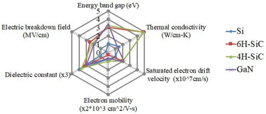 In order to directly connect SST-based AFE converter to the MV grid (6.6–15 kV) and have the ability to operate at high switching frequency, there needs to be exploration of wide-bandgap (WBG) devices such as SiCs and GaNs. The physical properties of WBG devices in comparison to Si-based devices are shown in Figure 10 [53,62,63]. The SiC devices are the preferred option for SST based systems as it can operate at higher switching frequency and operating temperature. These features significantly minimizes volume, size, weight of heat sink and magnetics size [62,63].