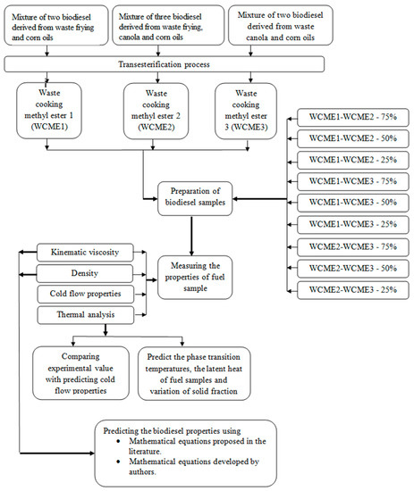 Therefore, the aim of this study was to expand on the previous analyses on the subject [30,31] specifically: a) the effect of a long-term storage period of eight months for WCME1 and 30 months for WCME2 at a constant temperature on biodiesel properties was explored, b) the influence of the blending of WCME1, WCME 2 and WCME3 on biodiesel properties including viscosity, density and cold flow properties was investigated, c) the accuracy of generalized correlations in the prediction of kinematic viscosity and density for wide ranges of temperature and volume fraction was improved and d) the predictive capability of obtained correlations in estimating the properties of biodiesel blends in terms of kinematic viscosity and density were examined. To the best of the authors’ knowledge, this is the first study to investigate the properties of a biodiesel mixture derived from waste frying-corn, frying-canola-corn and canola-corn cooking oils with various ages.