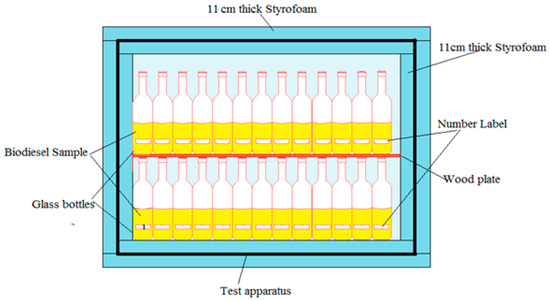 Figure 2 shows a conceptual drawing of the storage tank used to keep the biodiesel samples in the current study. The tank was thermally isolated from any heat transfer by 11 cm thick Styrofoam layers. It was used for long-term storage of the biodiesel samples under an appropriate constant temperature (24 ± 1 °C). For storage of the biodiesel, 1000 ml glass bottles, because this material would not react with the biodiesel and they can be used for storage under different conditions. The bottles were left open for one day and cleaned with acetone before being filled with fuel sample. Additionally, the biodiesel samples were filled up to half of the total volume of the bottle and kept in a dark place to avoid contact with the metal lid closures of the bottle and with any light. The samples were stored for various time periods and the kinematic viscosity, density and cold flow properties were periodically measured.