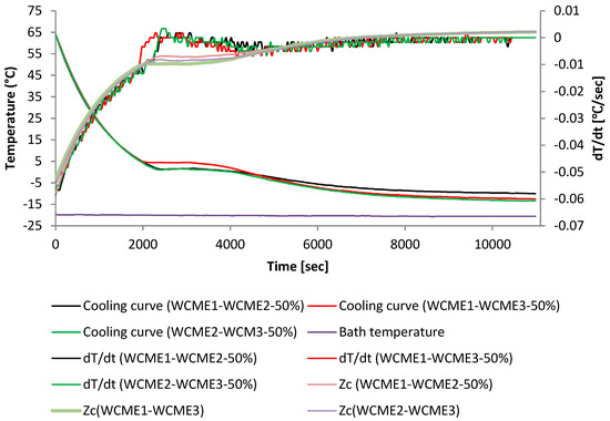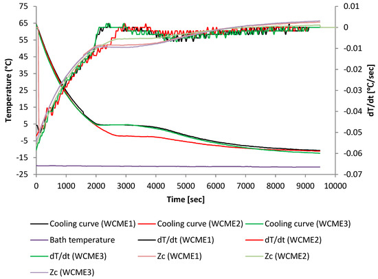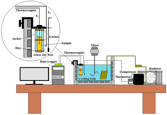 Figure 3 schematically presents the experimental setup for CA-CCA. An Ordel Data Logger with five channels was used to record the temperatures (the temperature of the biodiesel sample (T1) and cooling bath temperature (T2)), as shown in Figure 3. Ethyl alcohol was used as the coolant liquid in this study due to its low freezing temperature (–114.1 °C). The cooling bath was insulated with 11 cm thick Styrofoam to prevent heat transfer between the coolant and the environment. Additionally, two T-type thermocouples were used to measure the temperature of the sample and the cooling bath. It should be noted that both thermocouples were calibrated with reference to the standard thermometer. The difference between the temperatures of both thermocouples was found to be ± 0.1 °C. Moreover, a thermostat was used to control the temperature of the bath. To ensure the temperature of the bath was uniform and homogenous, a thermostat wire was utilized to measure the temperature of the bath and compare it with T2. As shown in Figure 3, the compression unit consisted of a compressor, temperature display and control unit. The compressor cooled down the refrigerator gas and the control unit (thermostat) was adjusted to the required temperature for this study. A stirrer was used for thermal homogeneity of the ethanol in the cooling bath. In the current study, the cooling bath was cooled down to −20 °C and the biodiesel sample was heated up to 65 °C. The Newtonian analysis was performed with a sample size of 45 ml biodiesel in a glass test jar. An aluminum cylinder jacket was placed in the middle of the cooling bath. A 6 mm thick cork disk was placed at the bottom of the jacket as a thermal insulator. The glass test jar was filled with the biodiesel sample to a level of 54 mm corresponding to a sample volume of about 45 ml. Two gaskets were placed into the test jar to ensure the jacket fitted jacket and there was a uniform air gap of 5 mm in the radial direction between the test jar and the jacket. The Newtonian technique based on CA-CCA used to characterize properties of the material is discussed in detail in References [37,38,39]. The heat balance equation for the solidifying can be rewritten as: