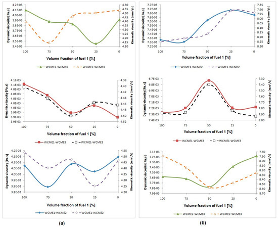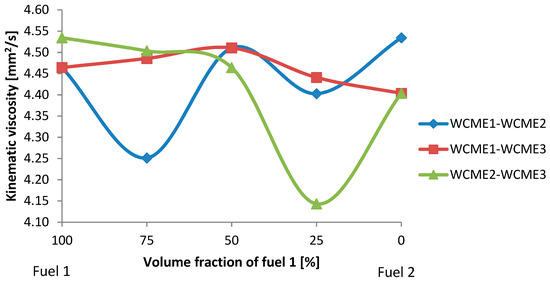 - For WCME1-WCME2; the kinematic viscosities of pure WCME1 and WCME2 were higher than the viscosity of the blends. Additionally, WCME1-WCME2-50% had the highest value of viscosity compared to WCME1-WCME2-75% and WCME1-WCME2-25%.