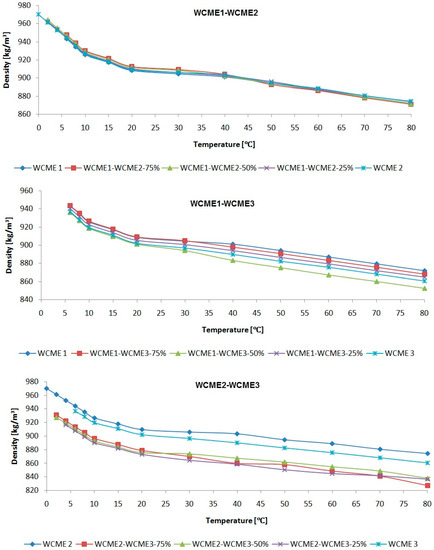 Figure 5 demonstrates the variations of densities of the biodiesel samples measured by the authors with respect to testing temperature. The results indicated that the densities of all biodiesel samples were in the range of 867–900 kg/m3. It was observed that the density of the samples decreased when the temperatures of all tested fuels are increased. Moreover, it was observed that the densities of the WCME2-WCME3 blends were lower than the density of the pure biodiesels (WCME2 and WCME3).