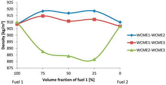 Density versus volume fraction at the temperature of 15 °C (WCME1-WCME2: WCME 1 and WCME2 are considered as fuel 1 and fuel 2; WCME1-WCME3: WCME 1 and WCME3 are considered as fuel 1 and fuel 2; WCME2-WCME3: WCME 2 and WCME3 are considered as fuel 1 and fuel 2).