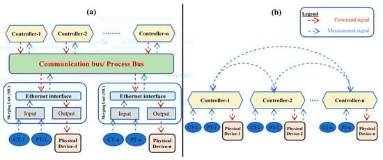 Control schemes according to: (a) the IEC 61850 process bus concept, (b) the conventional distributed control.