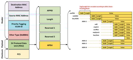 An SMV datagram follows a modified Abstract Syntax Notation One (ASN.1) Basic Encoding Rules (BER) Tag/Length pair encoding scheme [23]. Figure 2 shows the structure of an SMV datagram. It is composed of three parts, namely a header, a payload and a checksum. The SMV header starts with a destination address, which is one of the multicast MAC addresses listed in the IEC 61850 standard that start with 01 0C CD 04, followed by the source device’s MAC address. IEC 61850-9-2, which covers the specifications for SMV messaging [24], also recommends the implementation of Virtual Lan (VLAN) and priority tagging based on IEEE 802.1Q followed by the Ethernet type, which is 0x88BA for SMV messages [25].