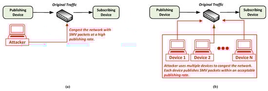 DoS refers to the time when a device (or a user) is denied access to a service by an attacker. A possible method to launch a DoS attack could be by flooding the network to delay delivery of packets beyond the critical flooding rate. This is achieved by clogging the communication channel and draining the computational resources of the communicating devices. Network flooding can occur on the Network or the Application layer of the OSI model. In this manuscript, we are interested in DoS attacks on the process bus. As can be seen in Figure 3, there are two ways to flood a process bus with unwanted traffic. The first is by transmitting SMV packets with a high transmission rate, which will delay the transmission of legitimate SMV packets beyond 3 ms. Utilizing the APPID of SMV messages and monitoring the rate of each message will allow the detection of this for of DoS. Only two publishing rate are allowed for SMV messages per the recommendations of the IEC 61850-9-2LE standard. These are: 80 samples/AC cycle or 256 samples/AC cycle for 50 Hz and 60 Hz systems, respectively. Violating these rates for a certain SMV stream will allow the detection of a DoS attack.