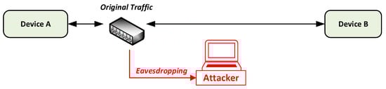 As shown in Figure 4, eavesdropping refers to when an attacker passively sniffs network traffic. Thus, the term eavesdrop. Although this is a passive attack, the attacker performs eavesdropping attacks to increase his/her advantage by gaining knowledge about the power system. Starting from the IP Layer of the OSI model, encryption can be used to defend against eavesdropping using techniques, such as Secure HTTP (HTTPS), Secure File Transfer Protocol (SFTP), and Secure Shell (SSH). Scanning network cards in promiscuous mode as well as monitoring network traffic are viable defensive measures [32].