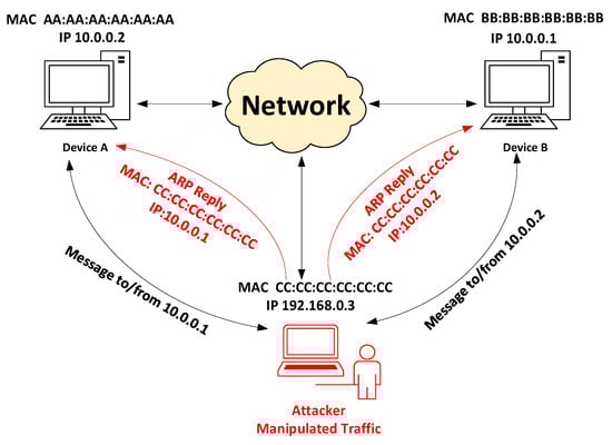 In an MITM attack, an attacker intercepts traffic between two devices through Address Resolution Protocol (ARP) Poisoning. ARP is a communication protocol, which is used to convert IP addresses into MAC addresses [33]. As shown in Figure 6, in ARP Poisoning, an ARP reply is sent by an attacker to change the IP to MAC addresses mapping on a given the network. Therefore, there will be incorrect association between IP and MAC addresses. This will allow an attacker to interrupt the messages transmitted between the communicating devices, and to manipulate them.