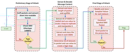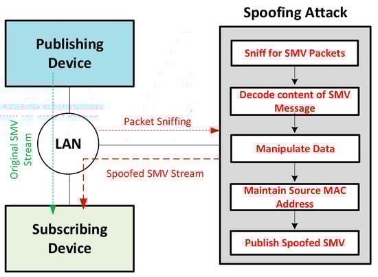 In an SMV spoofing attack, an SMV packet with changed data field(s) is transmitted to the process bus by an attacker’s device, while keeping the MAC address of the legitimate publisher unchanged, as depicted in Figure 7. This is feasible since SMV packets are not encrypted. An attacker can record an SMV packet, decode its contents, manipulate certain fields, and retransmit the spoofed message to the process bus.