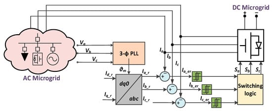 The system being studied is a DC microgrid tied to an AC microgrid by a bidirectional inverter, introduced in Figure 8. The AC microgrid comprises: