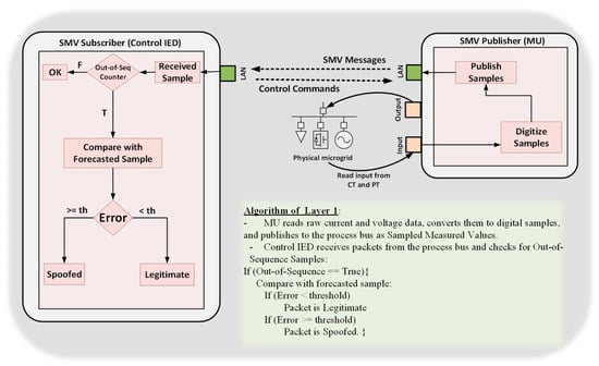 Each of the network-based and host-based systems has its advantages and disadvantages. The main focus of this manuscript is to conduct a feasibility study of using neural network forecasters to detect spoofed SMV packets. We chose to experimentally verify our proposed bi-layer algorithm on an IED and a MU as a proof of concept. However, the actual implementation in the field (i.e., real systems) could be improved. For example, on the network level, we could monitor the cyber-side information (ID and counters), and if an anomaly is detected (repeated counters for instance) then the specific IED could be triggered. Thus, each IED will be responsible for verifying the integrity of the SMV packets coming into it.