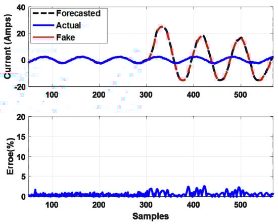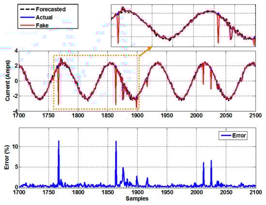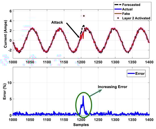 The malware script was used to inject a small perturbation to the current value at sample 1200. In this small perturbation attack, the NN forecasting error started to accumulate. At this stage, the AI module monitored the rate of change of the error of the next few samples. As seen in Figure 17, the error derivative was increasing indicating that indeed an accumulation of the forecasting error between the received and forecasted samples was occurring. Therefore, the IED sent a flag to the merging unit including the position (i.e., sample 1200) of the suspected sample to activate layer 2 of the proposed framework. Both the control agent and its merging unit performed the statistical study explained earlier. The results of the statistical analyses showed a difference in the calculated mean, variance, and standard deviation. This means that the forecasting error accumulated due the perturbation attack.