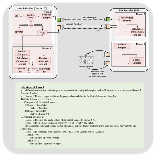 For the hardware implementation, the authors used the open source libIEC61850 library to program two Odroid C2 microcontrollers. One was programmed as an IED that subscribes to SMV packets, whereas the other was programmed as a MU that publishes SMV packets. The bi-layer algorithm was implemented on those devices as shown in Figure 15 of the manuscript.