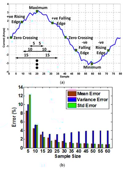 Next, five samples were taken before and after the peak sample and the mean, variance, and standard deviation were calculated. The same were also calculated to the same sample from the original data (i.e., with the actual value instead of the fake sample). The error of both statistical vector indicators was then calculated for all the fake data cases. Next, the dataset size was increased to 10 before and 10 after the fake sample and the error was calculated. The same procedure was then repeated reaching a dataset size of 60 samples before and 60 samples after the fake sample. The same procedure was repeated at all the critical locations in the sinusoid: the minimum, negative/positive rising/falling edge, and zero crossing. All the error data were then averaged for each data set size and are plotted in Figure 16b. As shown in Figure 16b the most indicative dataset (largest errors) was for 5 samples before the suspected sample and 5 samples after it.