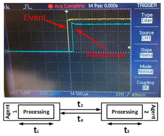 In order to calculate the latency of the proposed algorithm, the following experimental setup was prepared. A High logic value was put on the digital input of the Odroid device representing the IED. The device was programmed to send the flag to the MU once a High value is detected on its digital input. The device then calculated its own statistical indicators, waits until it received the output of the MU, and takes a decision. Once the decision is made, the IED generates a logic High on one of its digital outputs. The digital input and the digital output of the IED were connected to the oscilloscope shown in Figure 19 in the manuscript.