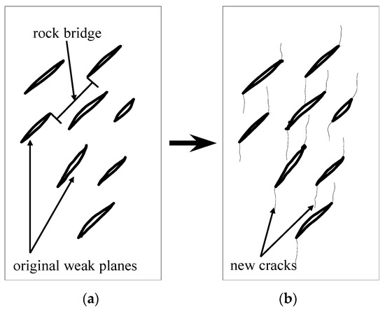 Sketch showing fracture development controlled by discontinuous weak planes under compressive stress. (a) Fracture distribution before loading; (b) Fracture distribution after loading.