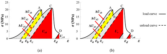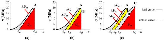 When the stress reaches its residual strength, unloading takes place forming curve on the stress–strain graph with strain recovery point (Figure 5a). The increment of energy dissipation can be calculated from Equation (12):