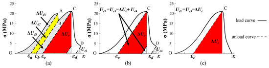 When the stress reaches its peak, unloading takes place forming curve on the stress–strain graph with strain recovery point . The increment of energy dissipation can be calculated from Equations (9) and (10):