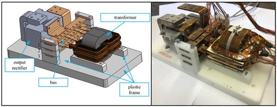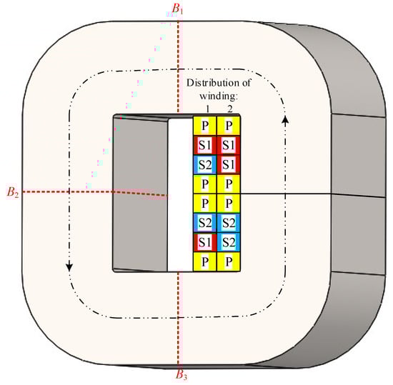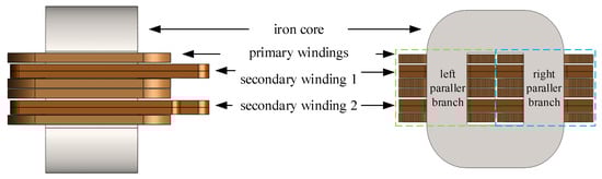 From the obtained measurements it was shown that the total secondary resistance (windings combined with the bus system) was lower for proposed winding arrangement in comparison to the original arrangement. This was due to slightly shorter net path of the currents trough the winding combined with the connection between the transformer and the output rectifier. Furthermore, the total resistances of both secondary branches were better balanced compared to the original arrangement. An imbalance of secondary resistance can lead to drift of magnetic flux inside the core and consequently to its saturation [6,8,9]. Furthermore, the iron core of the transformer was equipped with several measuring coils as shown in Figure 8.
