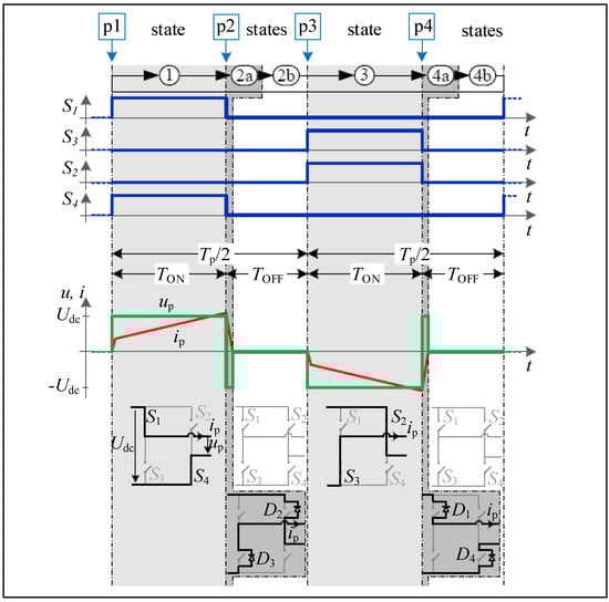 The presented transformer is only a part of the RSW system. The transformer is on the primary side connected to the H-bridge and on the secondary side to the output rectifier, as shown in Figure 1. Both connected parts determine the operation of the transformer, that is, how the electromagnetic variables inside the discussed transformer change with time. These variables generate power loss inside the transformer, therefore the analysis of operation is crucial. The operation of the RSW system can be broken down into 4 characteristic states that depend on the state of the H-bridge converter. These 4 states are shown in Figure 3.