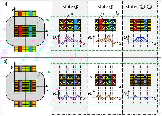 Due to the specific design, mmf in the iron core window acts predominantly along the y-direction. According to the presented conduction states, the distribution of the mmf in the iron core window can be easily approximated by considering that the density of current in the windings is uniform. According to the Ampere’s Law, is therefore changing linearly in respect to the length of the core window (x-axis) as shown in Figure 6a).