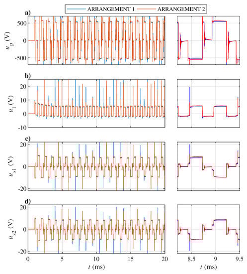 Comparison of measured primary and secondary voltages for both winding arrangements: (a) voltage in the primary winding , (b) output voltage , (c) voltage in the secondary winding 1 and (d) voltage in the secondary winding 2 .