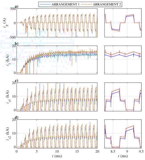 The obtained result have shown that the induced voltages in the secondary windings were slightly higher in the proposed winding arrangement in comparison to the original one. The RMS values of induced voltages in the secondary windings in the case of winding arrangement 1 were V and V. Compared to this, when winding arrangement 2 was applied, these values were V and V. This increase was attributed to lower leakage magnetic fields in the transformer window combined with lower total resistances on the secondary side of the transformer when improved winding arrangement was applied. Corresponding currents are shown in Figure 10.