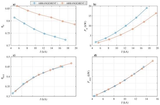 Comparison of determined power loss and efficiency of the transformer (a,b) and output rectifier (c,d) for both winding arrangements.