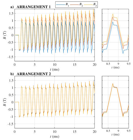 Results of the calculated densities of magnetic flux density B for: (a) arrangement 1 and (b) arrangement 2.