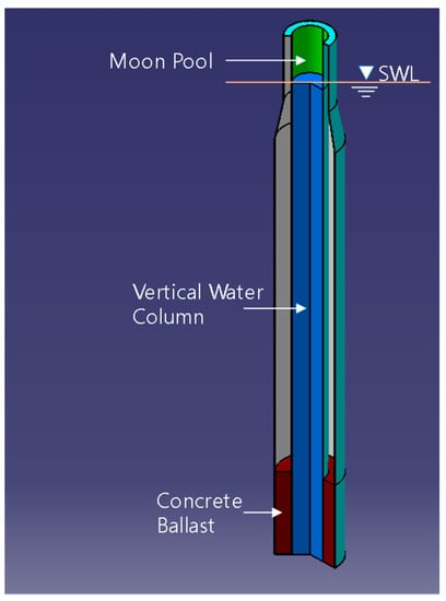 The South Korean government has released an ambitious plan, known as “Renewable Energy 3020”, to increase new renewable energy source power generation by 48.7 GW by 2030. The target is to provide 16.5 GW from wind energy which includes 13 GW from offshore wind. Focusing on a water depth of 150 m in the East Sea offshore area of South Korea, floating offshore wind turbines (FOWT) are considered to be the best candidate to fulfill this target. The main types of floating foundations are the semi-submersible, spar, and tension leg platforms (TLP). The semi-submersible concept is stabilized by the water plane area of the column separation which provides a large restoring force to the roll and pitch, and hence, requires large platform displacement. The first demonstration of semi-submersible concepts are Principle Power (WindFloat) [1] and Fukushima FORWARD [2]. There are also several semi-submersible model designs [3,4,5,6,7]. The TLP concept is stabilized by a high-tension mooring system; for this reason, the anchor system for TLP is complex [8,9,10]. The spar concept usually uses heavy ballast materials such as concrete at the bottom to provide a lower center of gravity for stabilization [11,12,13,14,15].