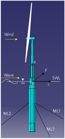 In this study, a conventional catenary mooring system is designed for all models of the spar-type platform combined with a moonpool. The mooring system sustains the floating wind system via three catenary mooring lines. Mooring line (ML) 2 is directed in the upwind direction and ML1 and ML3 are arranged uniformly around the platform. The horizontal stiffness of the mooring system is maintained at the same level as in the OC3-Hywind mooring system. The main parameters of the mooring line are selected according to the fact that the mooring line used is a studless chain, the material grade is R3 [21], and the nominal common link diameter is 90 mm. The total horizontal stiffness of the mooring system is calculated as in Equations (1) and (2) [22] by estimation of horizontal pretension TH. The mooring line length is set as in Equation (3).
