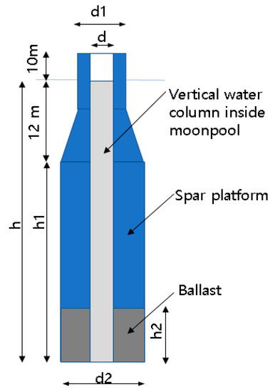 The main dimensions of the spar-type platform combined with a moonpool are the platform draft h, moonpool diameter d, upper diameter d1, and lower diameter d2. The elevation to the top of the platform above sea water level (SWL) is 10 m. These parameters are shown in Figure 4. The water plane area is kept the same as for the OC3-Hywind model in order to draw a comparison with their numerical simulation results. For a given moonpool diameter d, the upper diameter d1 is derived. The design space of the platform specification is determined from constraint conditions which are the pitch angle of the platform at the rated pitch θ5 smaller than 5 degrees and natural periods of heave and pitch larger than 25–30 s. Steel mass is calculated from the hull shape, which has steel plate thickness of 50 mm (average); the ballast mass is extracted from Equation (4). According to the distribution of the hull steel and concrete ballast, the center of mass and inertia of the platform are derived, respectively. Equations (4)–(7) are used in this step. The variables selected for this step are platform draft h, ranging from 55 to 100 m; moonpool diameter d, ranging from 2 to 10 m; and ballast materials of 2300 kg/m3 and 4000 kg/m3.