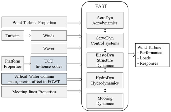 Fi(t) is the sum of the external forces matrix, composed of the hydrodynamic forces of the platform FH(t) including hydrostatic force, wave-exciting forces and current force; the restoring forces of the mooring system FM(t); the viscous drag forces from Morison’s equation; and the wind forces FW(t), including the aerodynamic forces of the wind turbine and tower drag forces. The total external forces are expressed in Equation (10). In order to calculate the coupled effect of the VWC inside the moonpool, the mass and the inertia of the VWC are added to the added mass matrix Aij in surge-surge, sway-sway, roll-roll, and pitch-pitch components. Using FAST v8 [23], a fully coupled hydro-aero-servo-elastic time domain analysis can be conducted for FOWTs. The strucutre of the FAST code is shown in Figure 6. The primary parameters, such as the elastic model of the blades and tower, aerodynamic properties of the blades, control schedule of generator torque and blade pitch angle, and hydrodynamic data of the platform, are input to FAST v8 to simulate all FOWT systems under complex environmental conditions.