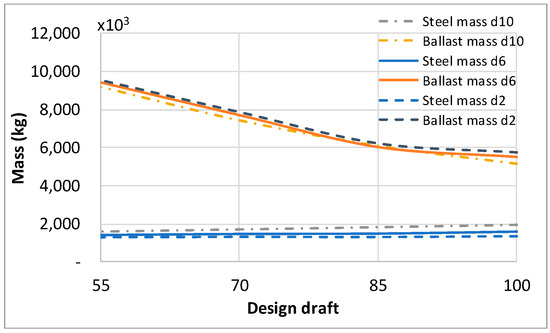 The results from the first step give a clear design space to select the platform parameters. With each dimension of the moonpool diameter and design draft of the platform, and for the concrete density, the rated pitch angle is calculated for each displacement of the platform. As can be seen in Figure 7, the smaller the rated pitch angles, the larger the displacements and the heavier the concrete density. To optimize the parameters of the platform in this step, 12 candidate models (M1-M12) were selected, which have rated pitch angles of about 5 degrees, being the limit of the design. By using concrete density 4000 kg/m3, three groups of moonpool diameters and four groups of platform design drafts are used to derive the remaining parameters of the platform for next step. The trends for steel mass and concrete ballast mass for those models are shown in Figure 8. Table 5 describes the main parameters of the candidate models.