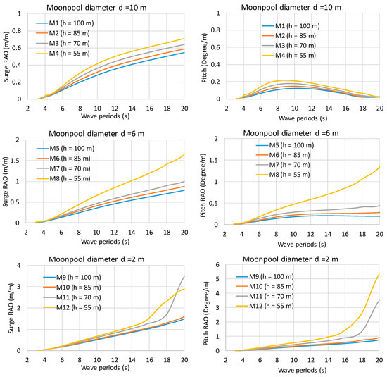 Table 5 shows that the lower diameter of the platform d2 increases when the platform draft h decreases, and as the moonpool diameter d decreases, d2 decreases. However, the platform masses of each platform draft group are similar. Therefore, the response analysis in the frequency domain in the second step is to optimize the platform draft. The comparisons of surge and pitch RAOs for the three groups of moonpool diameter with different platform drafts (Figure 9) show that a 100 m platform draft experiences the smallest response, while the 55 m draft experiences the largest. Therefore, here, three models of the 100 m platform draft are selected for the final step. Those are: model M1, the moonpool diameter (d) = 10 m; model M5, d = 6 m; and model M9, d = 2 m.