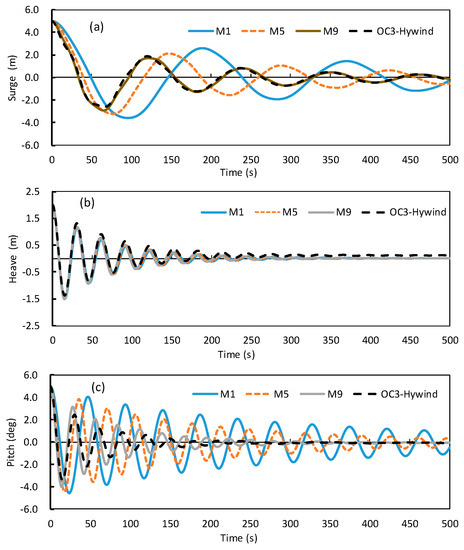 Comparison of the natural frequencies of the model M1, M5, M9, and OC3-Hywind between spreadsheet calculation and numerical simulation.
