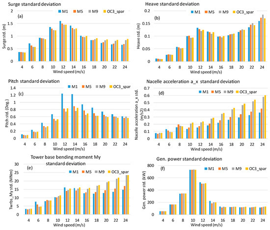 Standard deviation of models M1, M5, M9, and the OC3-Hywind model in DLC1.1 - normal operation cases: (a) surge, (b) heave, (c) pitch, (d) nacelle acceleration, (e) tower-base bending moment My, and (f) generator power.
