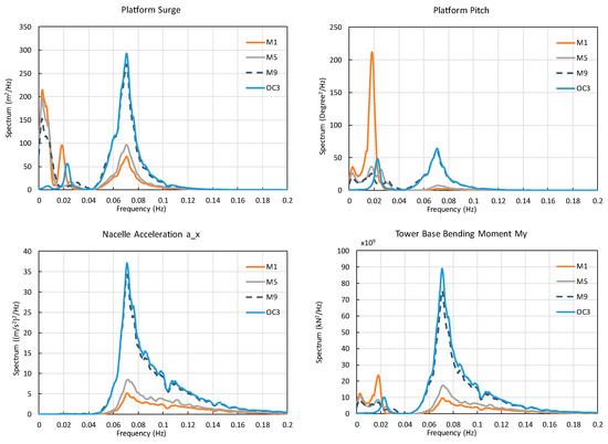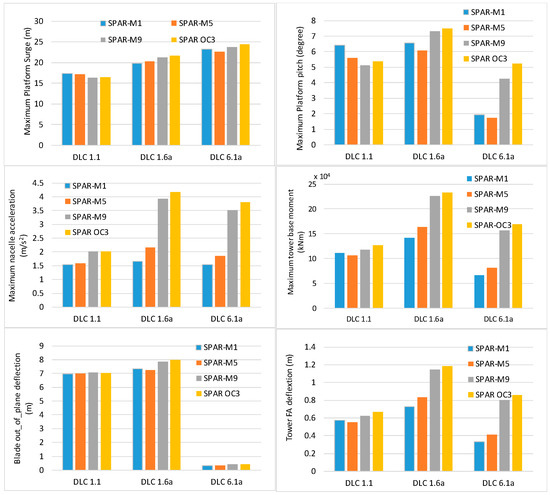 The extreme responses and loads of the four models were extracted from all time-series outputs of the three DLCs, as presented in Figure 13. The figure shows that the maximum nacelle accelerations in DLC1.6a of M9 and the OC3-Hywind model are over 0.3 g, where g is the gravitational acceleration; however, those of M1 and M5 are lower than that. Under extreme environmental conditions with the wind turbine being in parked conditions, the extreme loads and responses of M1 and M5 are smaller than those of M9 and the OC3-Hywind model.