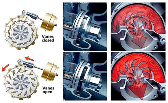 Turbocharging and boosting are key technologies in the continued drive for improved internal combustion engine efficiency with reduced emissions [1]. For more than a decade, engine boosting has seen widespread adoption by passenger and heavy goods vehicle powertrains in order to increase the specific power and enable the downsizing megatrend [2]. However, many challenges still remain, as the regulation requirements become stricter, and the demand for low-carbon powertrains increases [3]. Currently, the growing expectations of vehicle performance, including an excellent transient response with high boost levels, have converged within the demand for increased downsizing and higher levels of EGR. For boosting machinery, the rated power and torque for downsized units are conventionally regained via fixed-geometry turbocharging [4]. However, the transient behavior of such systems is limited by the usual requirement of a large size turbocharger, especially if a high-end torque is pursued [5,6]. VGT technology (see Figure 1), which is designed to vary the effective aspect ratio of the turbocharger under different engine operating conditions [7], can significantly improve an engine’s transient response and fuel economy compared with a fixed-geometry turbocharger [8].