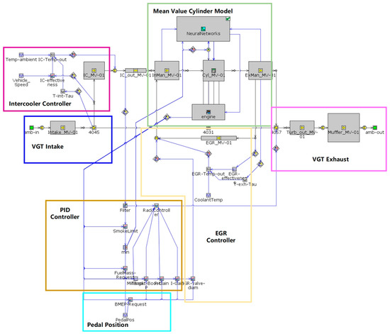 In this article, the boost control strategy is implemented on a six-cylinder, three-liter VGT-equipped diesel engine, which can be seen in Figure 2. A detailed engine model has been converted to a mean value model in order to reduce the run time without sacrificing transient accuracy [27] (see Ref. [15] for detailed explanation). Note that the mean value GT-Suite model (see Figure 3) serves as a “real” engine environment in this study, so as to show the results between the end-to-end and non-end-to-end model-free approaches, but the proposed method can be transferred to a real plant easily. In order to provide a comparison, the model is initially controlled by a fine-tuned PID controller.