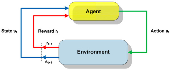 Reinforcement learning is a computational approach to learning whereby an agent tries to maximize the total amount of reward it receives when interacting with environment (see Figure 4) [28,29]. For every state , the agents always try to maximize the expected discounted return by choosing an action . The discounted return is defined as , where is a discount factor and stands for the reward that is observed by the agent after an action is exerted on the environment.