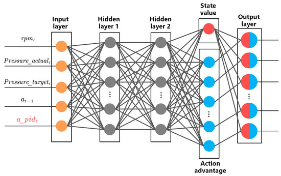 Reinforcement learning (RL), being as one of three machine learning paradigms, along with supervised learning and unsupervised learning, is the field of machine learning focusing on how control actions are selected in the environment in an optimal manner by trial and error [16,17]. The theory of reinforcement learning, inspired by the psychology of behaviorism, focuses on online learning and tries to maintain a balance between exploration and exploitation [18]. Different from supervised learning and unsupervised learning, reinforcement learning does not require any pre-given data, but obtains learning information and updates model parameters by receiving rewards (feedback) from the environment for actions [19,20,21]. Deep reinforcement learning (DRL), which excels at solving a wide variety of Atari and board games, is an area of machine learning that combines the deep learning approach and reinforcement learning (RL) [22,23]. The deep Q-network (DQN) strategy adopted on AlphaGo [24] and AlphaGo Zero [25] formed the first computer program that defeated human experts at the game of Go. It effectively solves the problem of instability and divergence caused by the use of neural network nonlinear value approximators through experience replay and fixed Q-Target, which greatly improves the applicability of reinforcement learning. Recently, Wang et al. [26] updated DQN by proposing an architecture that consists of dueling networks. Their dueling networks replace the state-action value by two separate estimators: one for state-value function, and the other for state-dependent advantage function. This is particularly beneficial if a control action does not have any influence on the environment in any situation. By doing so, their RL agent proved superior to the latest technologies in the Atari 2600 domain. However, the aforementioned model-free DRL algorithms typically require a very large number of random exploration before achieving a good control performance; thus, it is hardly possible to apply the algorithm directly on a real plant, and have to rely heavily on a simulation environment, especially when a control strategy has to be learned from scratch. In contrast, the traditional PID method can control a process from its beginning to its end, and deliver a complete function solution without needing to procure anything from a third party (i.e., the concept of end-to-end); therefore, it can be easily implemented on real controllers without relying on simulation models. Based on the discussion above and that there exists no simulation model at many times for the training of a pure DRL strategy, it is interesting to combine a traditional PID controller and an intelligent DRL strategy together in order to realize an end-to-end control using the latest DRL achievement in a real environment.