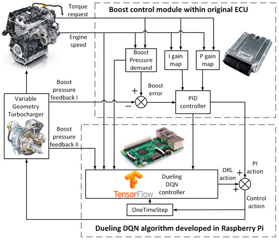 The updated dueling DQN algorithm implementation and the corresponding testing platform are illustrated in Figure 5. Unlike the classical DQN, which only produces a single output Q function, the dueling DQN use two streams of fully connected layers to provide the estimate of the state and the advantage functions before combining them to generate output Q functions. By separating the state value function from the Q function, the updated dueling DQN is capable of solving control problems whose estimate of the state values is of great importance, while for many circumstances, the choice of actions does not have any influence on the environment. The vane position controlled by a membrane vacuum actuator is selected for the control action, and the four quantities of engine speed, actual boost pressure, target boost pressure, and current vane position are used to group the four-dimensional state space. For the choice of immediate reward (), the function of the error between the target boost and the current boost () plus the action change rate ( is defined, and the specific formula is as follows: