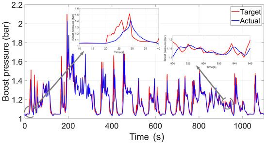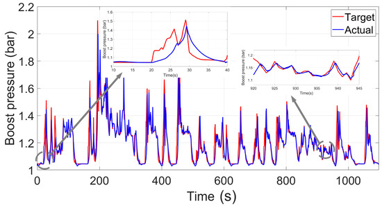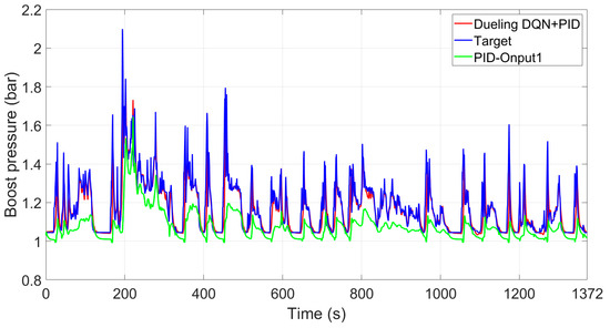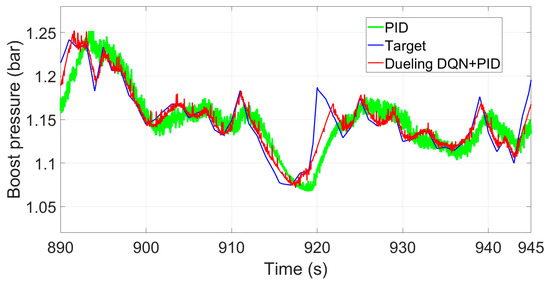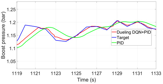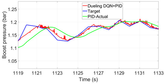 In order to show the generalization ability of the proposed hybrid algorithm, as indicated in Figure 12, the control behavior comparison between the fine-tuned PID and the proposed hybrid algorithm using testing dataset is conducted. Compared with the results of the fine-tuned PID controller (the parameters of the PID controller were initially optimized for the whole period of the FTP-72 driving cycle), the average control behavior based on the proposed algorithm performs marginally better, as indicated by the IAE of the PID being 9.84 and that of the proposed algorithm being 8.89. However, the actual boost pressure of the proposed algorithm suffers a high-frequency oscillation compared with the PID benchmark. In order to test its adaptivity, a continuous learning is implemented using a long driving cycle containing this specific driving cycle. After a short time, as shown in Figure 13, the agent is able to follow the target boost better, and the oscillation is almost eliminated, showing the superior adaptiveness of this hybrid algorithm.