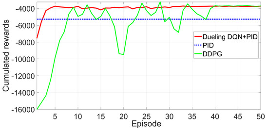 The learning curve that shows the cumulated rewards of each episode for the hybrid algorithm, the DDPG algorithm, and the benchmark PID controller can be seen from Figure 9. The trajectory of the DDPG algorithm (which has been published in [15]) illustrates a classical learning process from scratch using model-free DRL algorithms. It is shown that from the beginning of the training that the accumulated rewards for the DDPG agent per episode are extremely low, indicating poor control behavior, and after approximately 40 episodes, the accumulated rewards can be converged slowly to a higher value than that of the benchmark fine-tuned PID controller, indicating a preferable control performance. However, this approach cannot be directly applied on a real plant due to the possible plant damage resulting from its random and not wise control action when the agent has limited experience, especially at the beginning of the training. However, the proposed hybrid algorithm is distinct from the DDPG learning curve by offering the control strategy a good action baseline, making it practicable to train the algorithm directly on a real plant.
