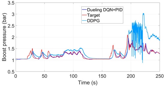 To make it clearer, the control behaviors of the DDPG and the hybrid algorithm at the very first training episode are shown in Figure 10. It is shown that the boost pressure of the DDPG algorithm is far away from the target, and due to its random control action (so as to realize extensive exploration), the boost pressure easily exceeds the safety margin. This may be forgiven in the simulation environment, but will most likely damage a real plant in one attempt, not to mention that this kind of model-free DRL algorithm requires a very large number of random actions to achieve good performance. However, for the proposed hybrid algorithm, the boost tracking performance at the very first episode is acceptable, and the boost pressure is well below the safety margin. This is because (1) the action range of the dueling DQN is limited; and (2) the PID acts as a compensator to modify the incorrect action implemented by the dueling DQN at the very first episode. Note that only after approximately five episodes, the hybrid algorithm has already been converged, and the accumulated rewards are basically the same as those achieved by the DDPG algorithm requiring nearly 50 episodes, indicating a superior computational efficiency. Figure 11 shows the control behavior of the proposed hybrid algorithm, and when it is compared with Figure 8, it can be seen that the control behavior based on the proposed hybrid algorithm outperforms that of the PID controller, with the IAE for each being 40.12 and 31.83, respectively.