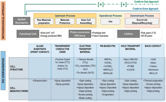 In the harmonization procedure employed in this work, only the manufacturing phase of the PSCs was considered, thus applying a cradle-to-gate approach. Given the very early stage of development of this PV technology, this approach was taken in order to reduce the uncertainty of the results. In fact, although a complete life cycle analysis should be evaluated to obtain a fair comparison of different options, the modelling of prospective scenarios for operational and End-of-Life phases at this level would not add reliable information for the purpose of the comparison developed in this study. All the raw materials employed in the production process of a PSC were modelled and included in this study.