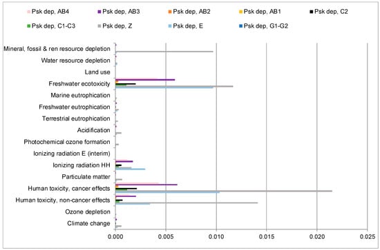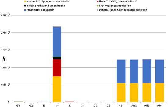 The graph in Figure 2 clearly shows that among the PSC configurations analyzed, five of them have an extremely high environmental impact [,]. This is due to the PSC device structures, which are characterized by various raw materials usage and manufacturing procedures. In detail, the S configuration [] reports an amount of gold in the back contact that is two orders of magnitude higher than in the other studies. Furthermore, the AB1-4 configurations [] have a direct metallic zinc (Zn) emission into the water that leads to a remarkable environmental load on categories dealing with toxicity.