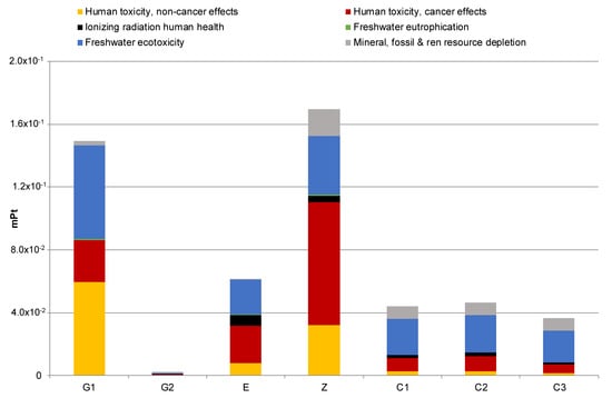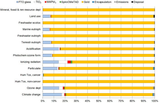 By analyzing the PSC configurations (Table 1) and the environmental profiles shown in Figure 3, the highest impact of the G1 and Z configurations appear to be mainly related with the manufacturing procedure and the materials used for the ETL, as well as with the metal used for the back contact. In order to investigate to what extent the unit processes and input flows contribute to the environmental profile of each PSC, a detailed inspection of the impacts connected with the manufacturing phase was performed with the characterization step of the LCIA method. In Figure 4, the results for the G1 configuration [] are shown in detail as it is the most common configuration reported in the literature and can therefore be taken as a reference.