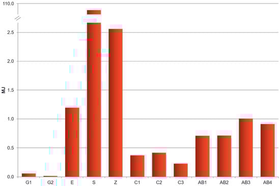 The G1 PSC configuration calculated with the CED—Single Score impact assessment method. Single product flow: Direct energy consumption.